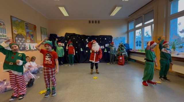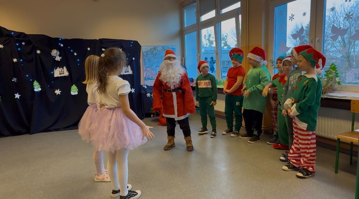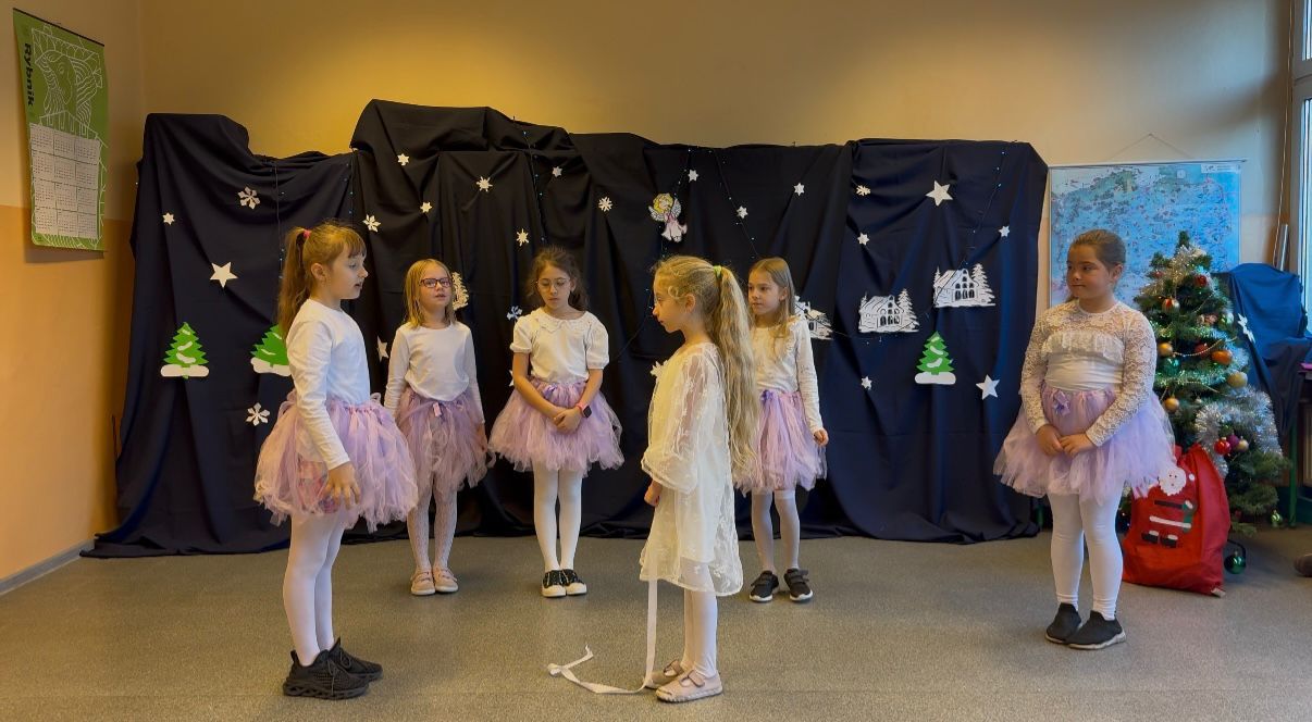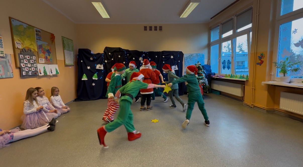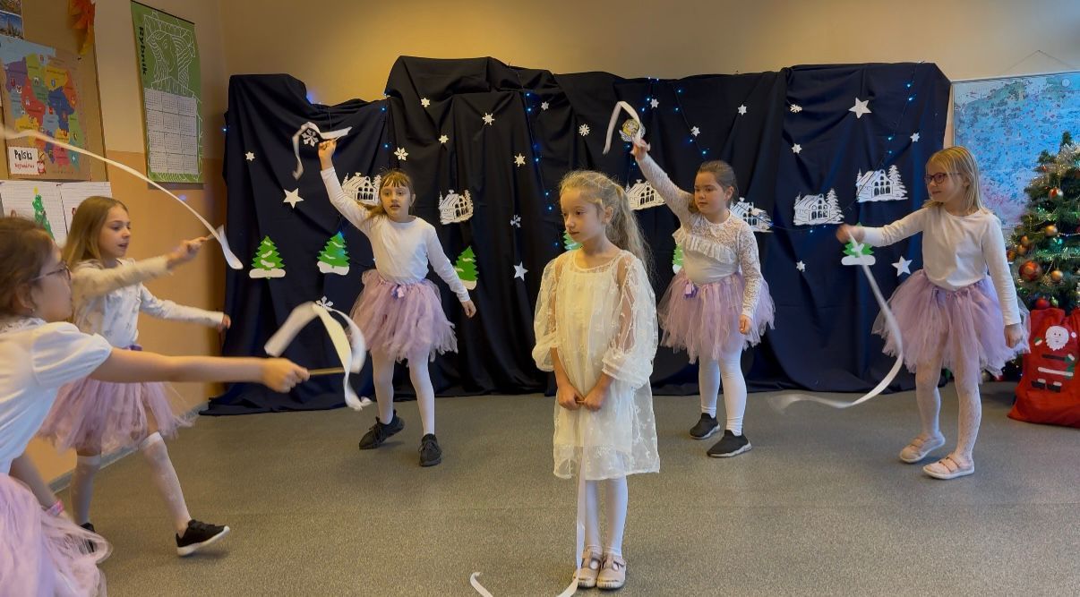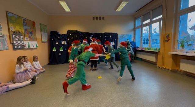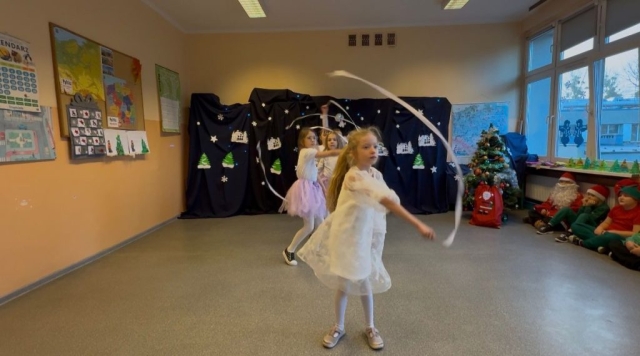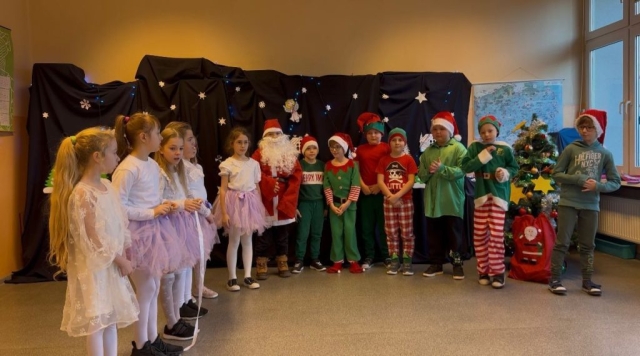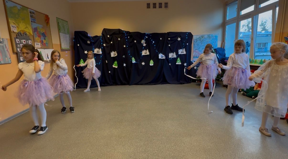 Podczas pięknego, zimowego przedstawienia  elfy i śnieżynki z 2b zawitały do szkoły wprowadzając wszystkich  w magiczny i świąteczny  nastrój.